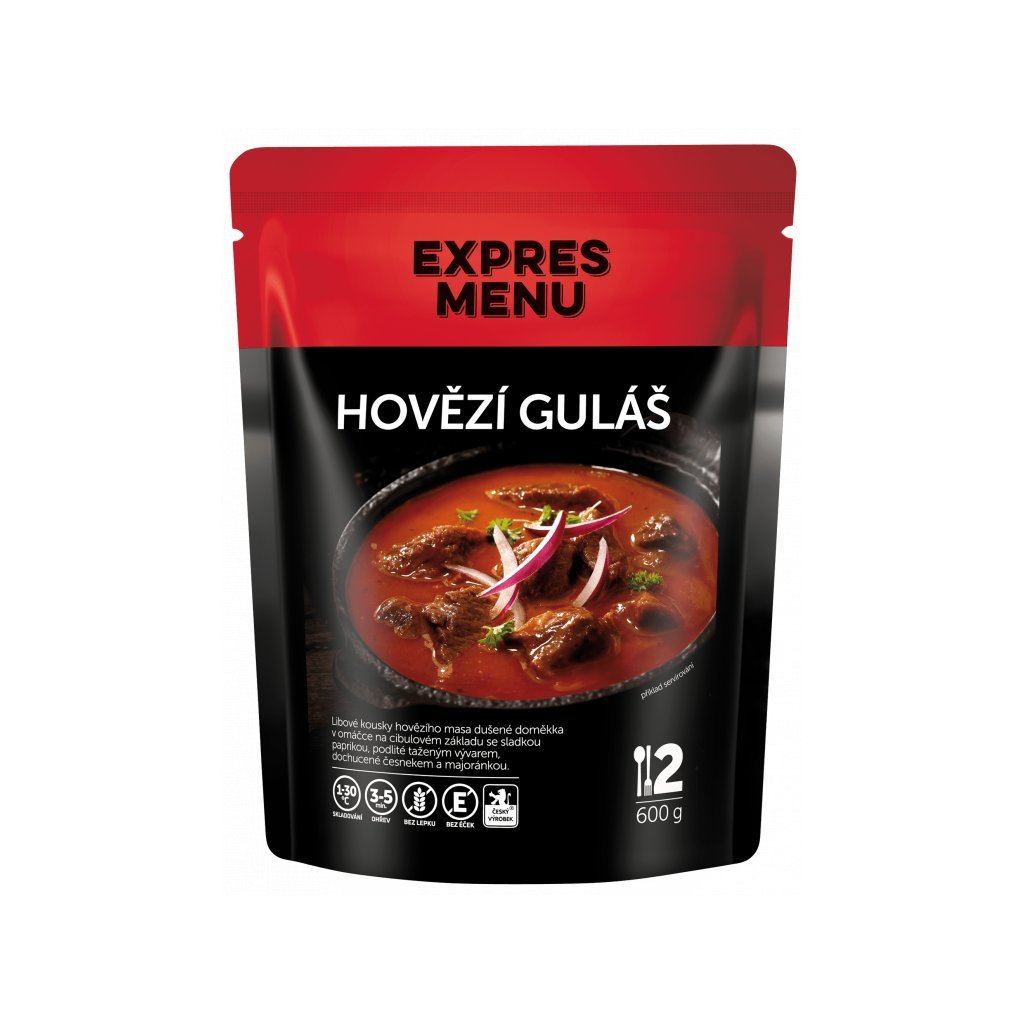 hovězí maso přední (31 %), hovězí vývar (voda, hovězí maso a kosti), cibule, rýžová mouka, česnek, kukuřičná mouka, řepkový olej, rajčatový protlak (voda, rajčatový protlak, sůl), paprika mletá, sůl kamenná, majoránka, kmín, pepř.