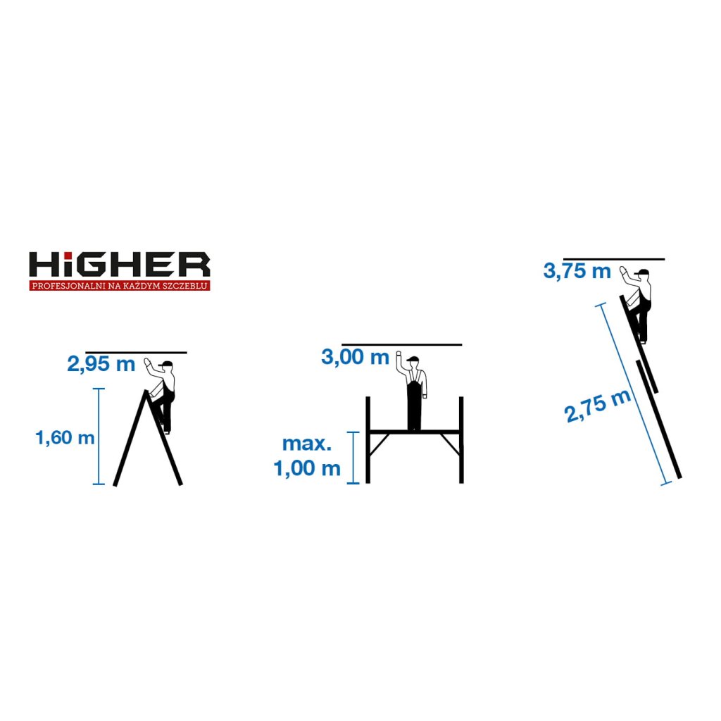 Jedná se o mini lešení 2x6 HIGHER, které lze použít jako 3 různé výrobky. Když potřebujete lešení - nastavíte pracovní plošinu a máte vynikající nástroj pro delší práci ve výškách. Pokud potřebujete žebřík - odstraníte plošinu a máte možnost sklopit dva typy žebříků: volně stojící, tzv. "malířský" a opěrný žebřík. Vynikající nástroj, který díky své všestrannosti bude fungovat v každém domě nebo dílně.