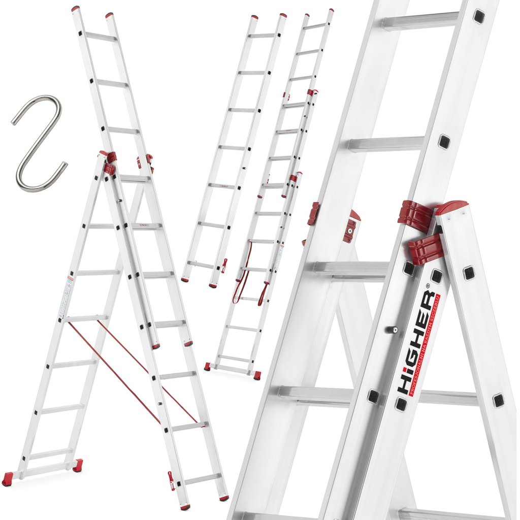 Tento hliníkový žebřík má 3 části, každá s 7 lisovanými, drážkovanými stupni o rozměru 28x28mm. Podélné části hliníkového žebříku HIGHER jsou vyrobeny z profilovaného hliníku o rozměru 55x20mm. Kluzké a bezpečné roztažení žebříku je zajištěno silnými hliníkovými vodicími lištami. Díky kompaktním rozměrům (délka pro přepravu je 2,01 m) a nízké hmotnosti 10,50 kg je tento hliníkový žebřík pohodlný pro použití a snadný na přepravu.