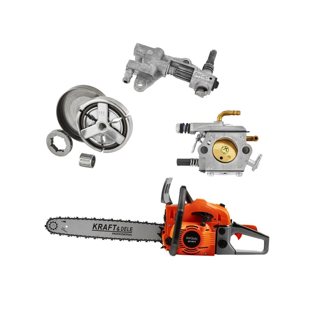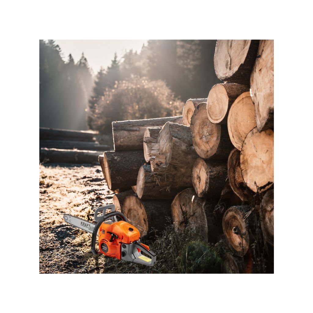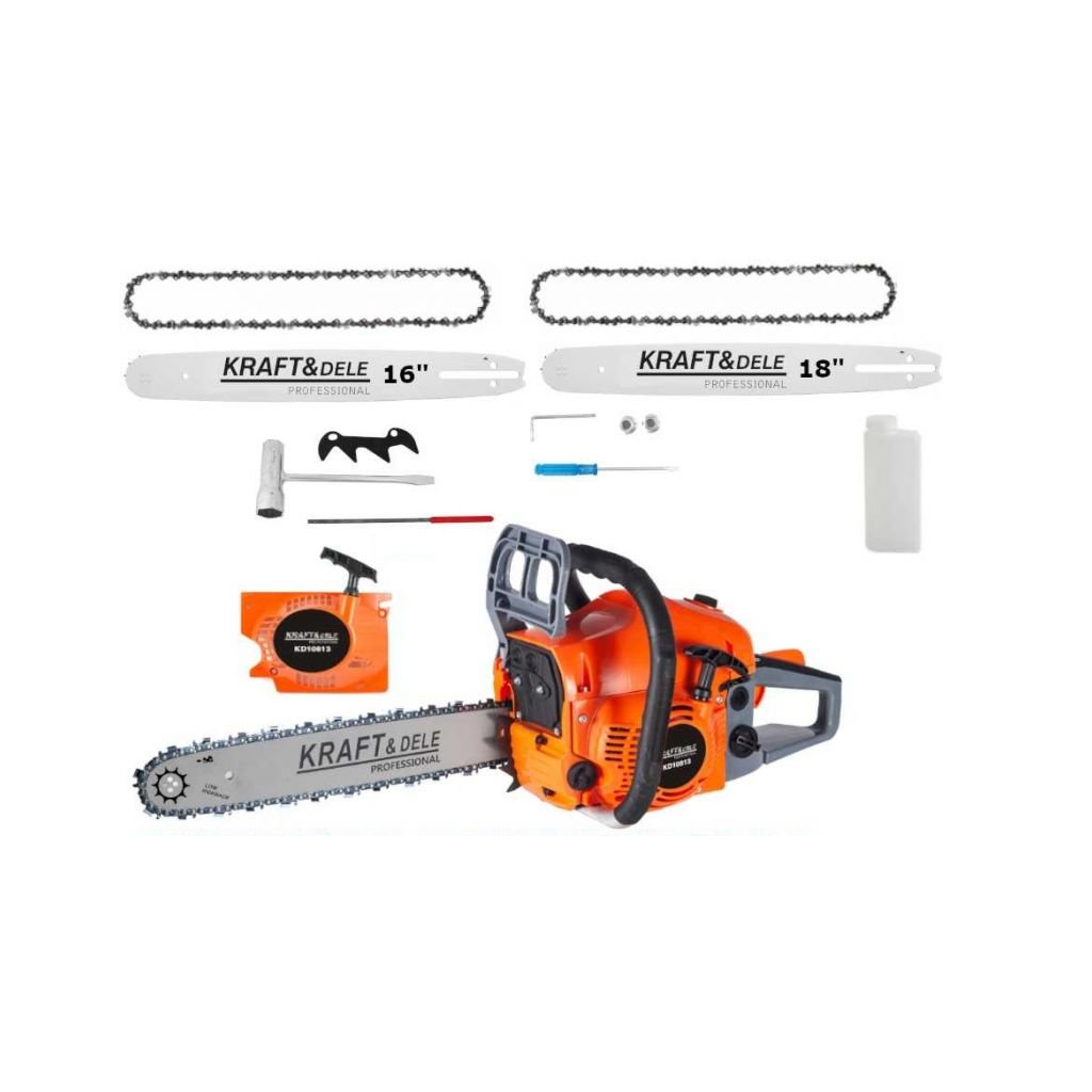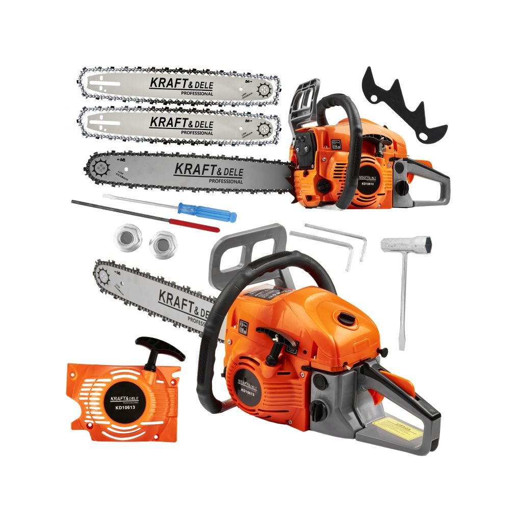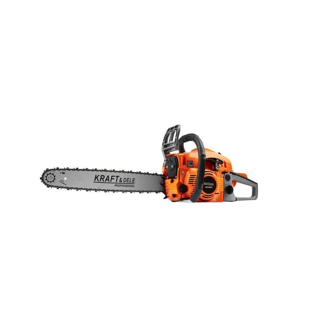 Kraft&Dele KD10613 řetězová benzinová pila 5,9HP 16"+18"Profesionální benzínová pila značky KRAFT&DELE o výkonu 5,9 HP je určena k zpracování dřeva jak pro lesní práce, tak i pro domácí použití.
