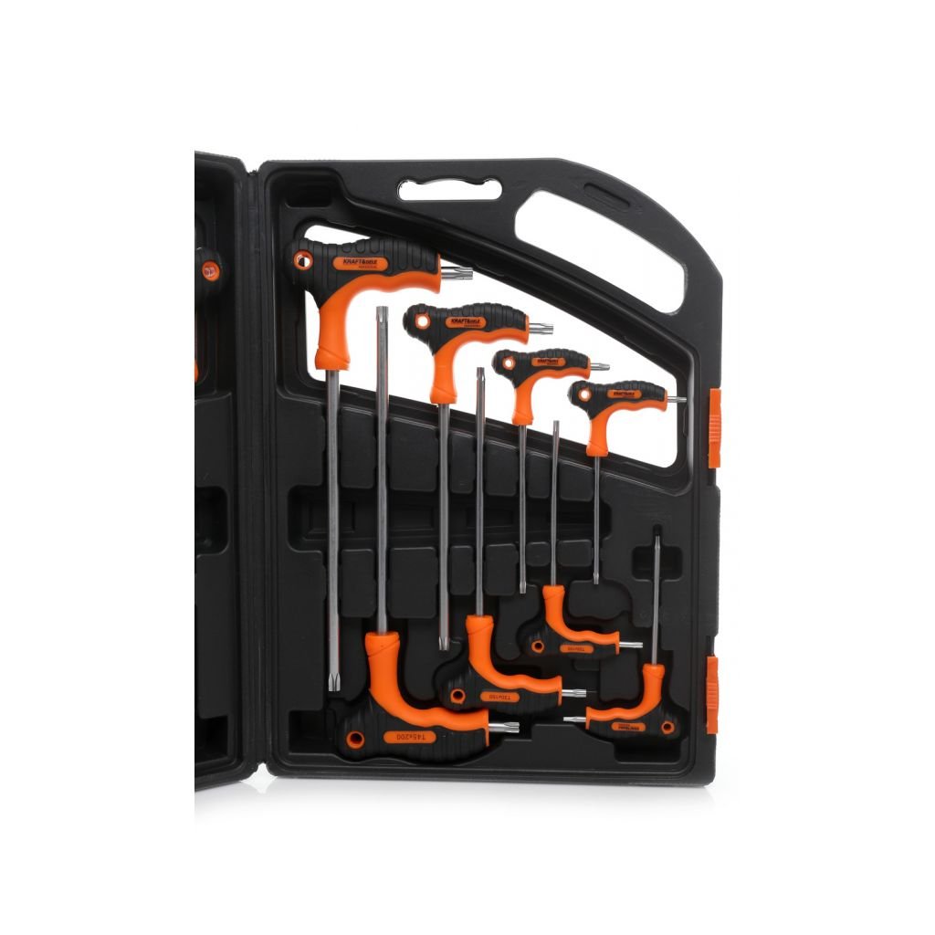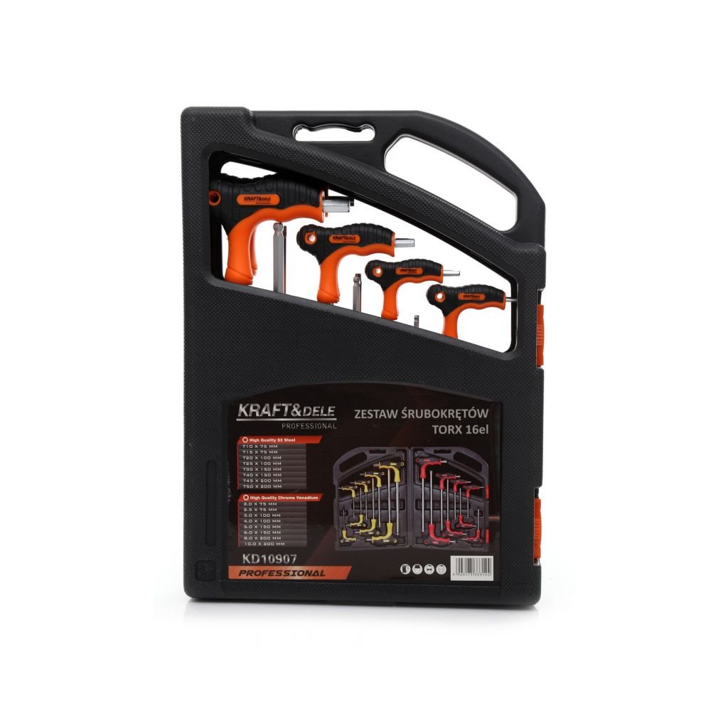 Sada šroubováků TORX KD10907 od značky Kraft&Dele je ideálním řešením pro dílny, garáže i domácnosti. Obsahuje 16 kusů šroubováků různých velikostí a typů, včetně imbusových a torxových šroubováků. Praktická přenosná plastová kazeta umožňuje snadné skladování a organizaci nářadí.