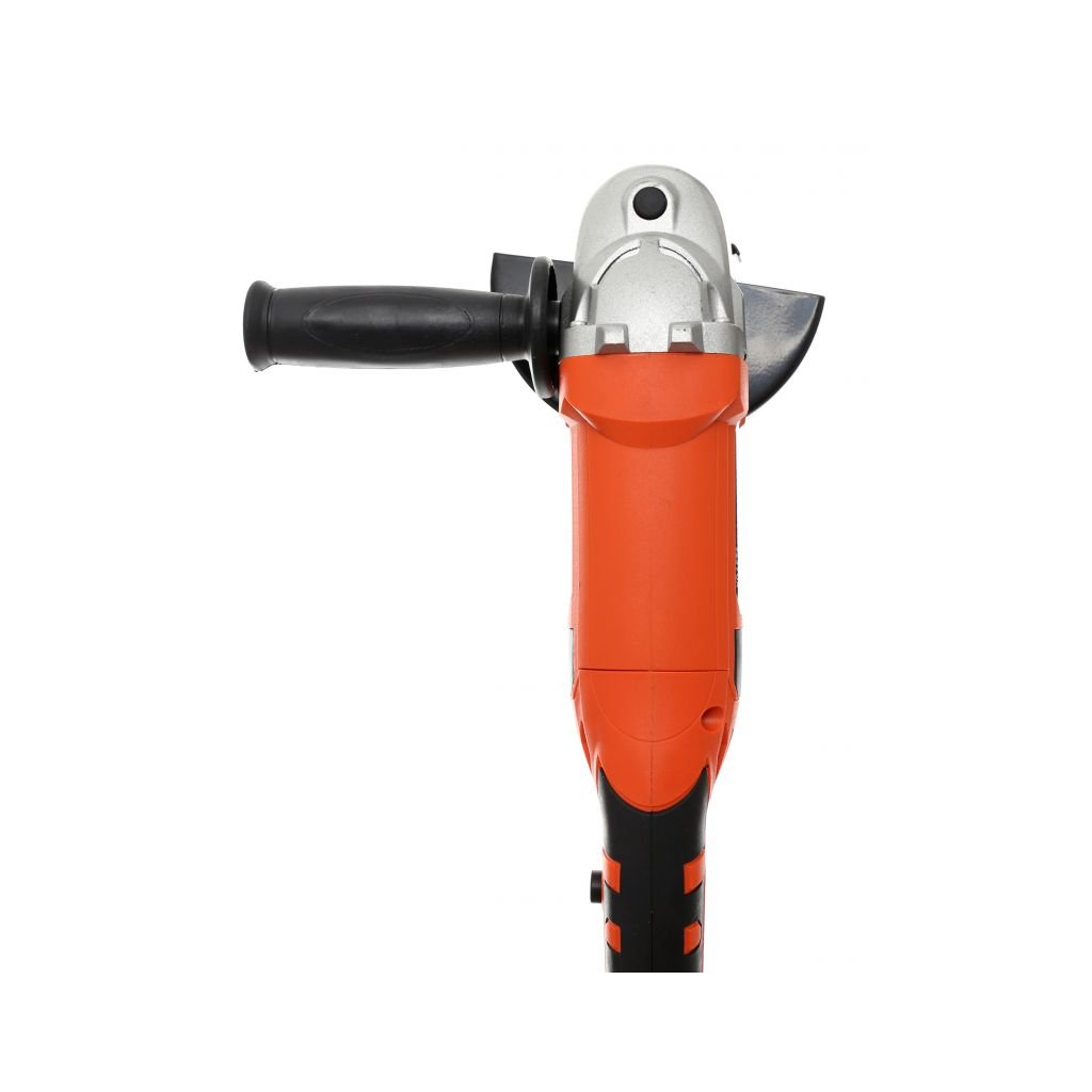 - Hlavní rukojeť je vyrobena ze speciálního protiskluzového materiálu, který zajišťuje snadné držení zařízení v ruce. Kryt převodovky je vyroben z hliníkové slitiny a výbava zahrnuje také přídavnou rukojeť a kryt kotouče
