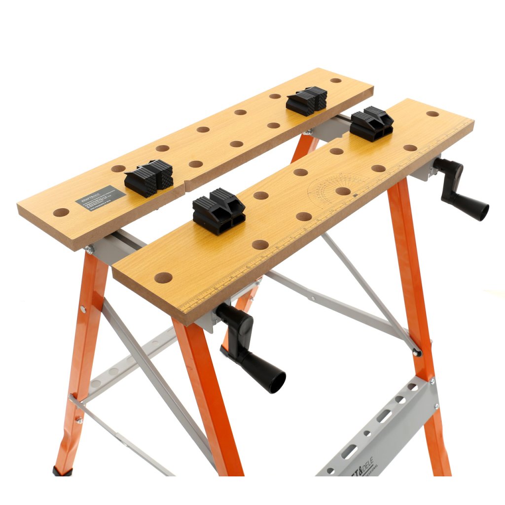 Má rozkládací pracovní desku, která má pevnou konstrukci, centimetrovou a úhlovou stupnici a dají se na ní připevnit různé předměty (např. disky kol, dřevěné latě a jiné)