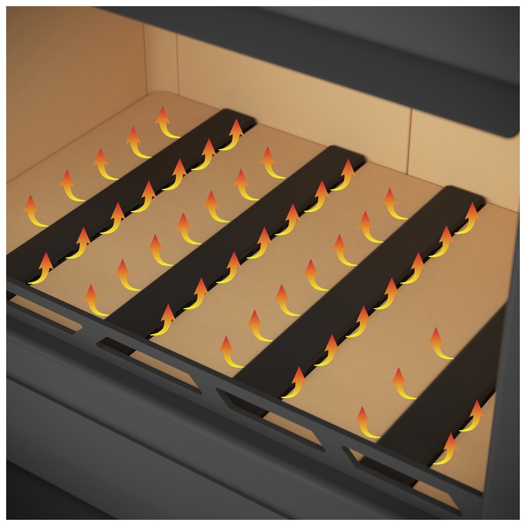 Revoluční řešení spalovací komory nabízí nepřekonatelný zážitek z ohně. Dřevo hoří po celé ploše dna, díky systému bezroštového spalování a systému kanálků na přívod vzduchu. Výsledkem je minimální spotřeba paliva. Pohled do ohně jsme povýšili na novou úroveň.