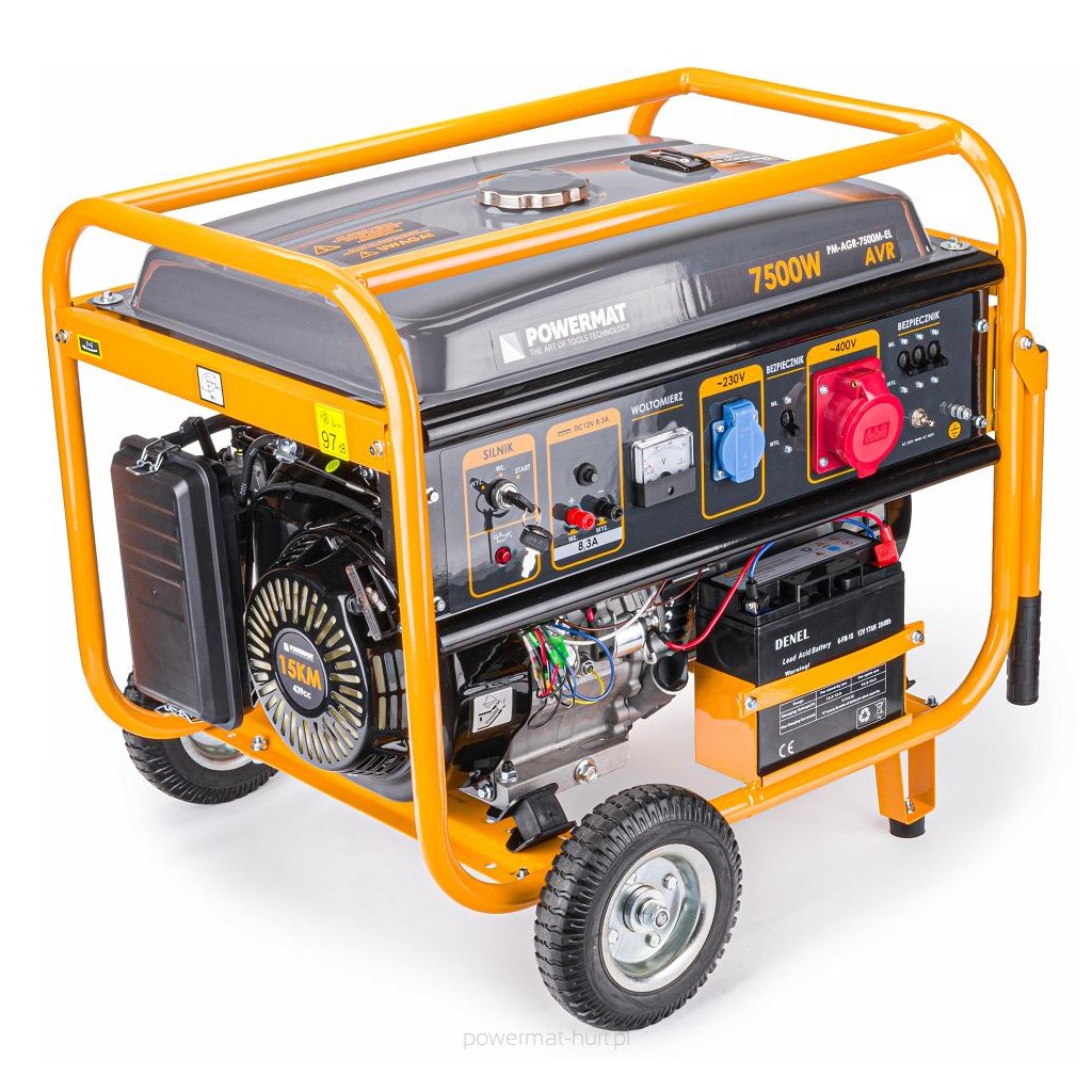 Generátor generuje elektrický proud s napětím 230 V (1 zásuvka) a 400 V (1 zásuvka). Perfektní řešení pro nedostatek elektřiny v terénu. Vybaveno voltmetrem a pojistkami. Generátor má snímač hladiny oleje, který automaticky vypne motor, pokud je jeho hladina příliš nízká. Spouštění generátoru - elektrického (klíčem) a ručně - kabelem. Jednotka používaná v řemeslech, stavbách na pozemcích a zahradách pro práci s elektrickým nářadím, čerpadly, osvětlením.