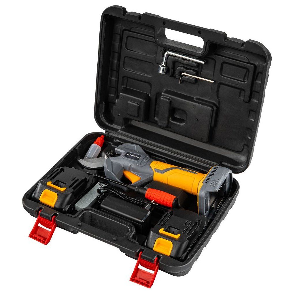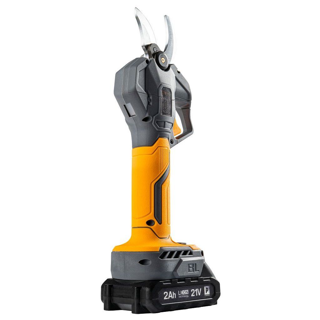 Silný aku sekátor s bezuhlíkovým motorem 1000 W pro přesné řezání větví do 30 mm. Dva režimy otevření ostří (15/30 mm), dvě baterie 2,0 Ah pro nepřetržitou práci a LCD displej s ukazatelem nabití a počtem řezů. V sadě nabíječka, transportní kufr, olej, nářadí a brousek.