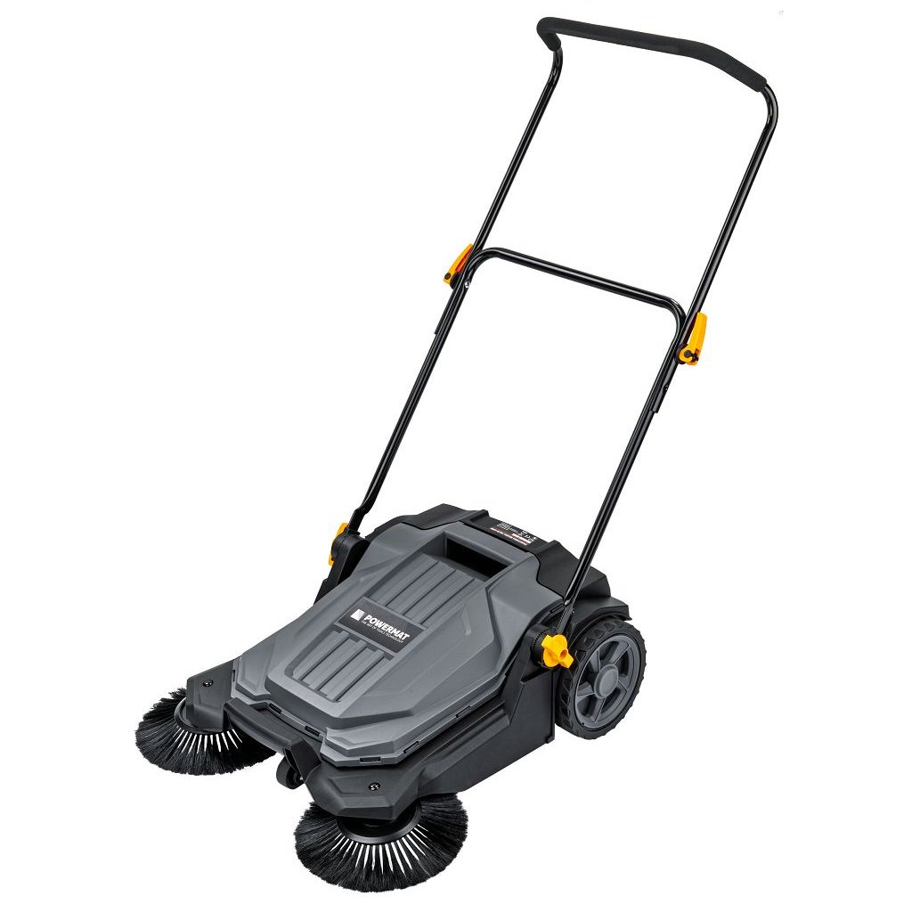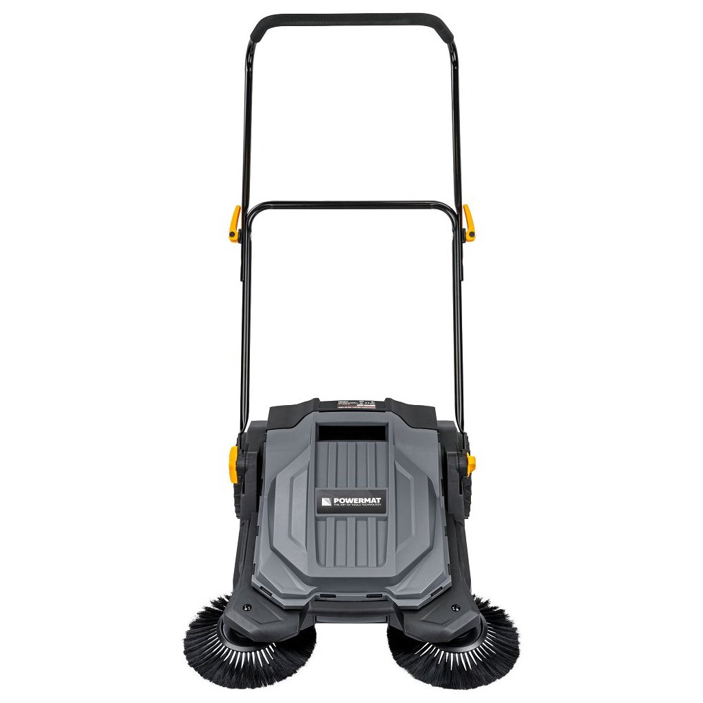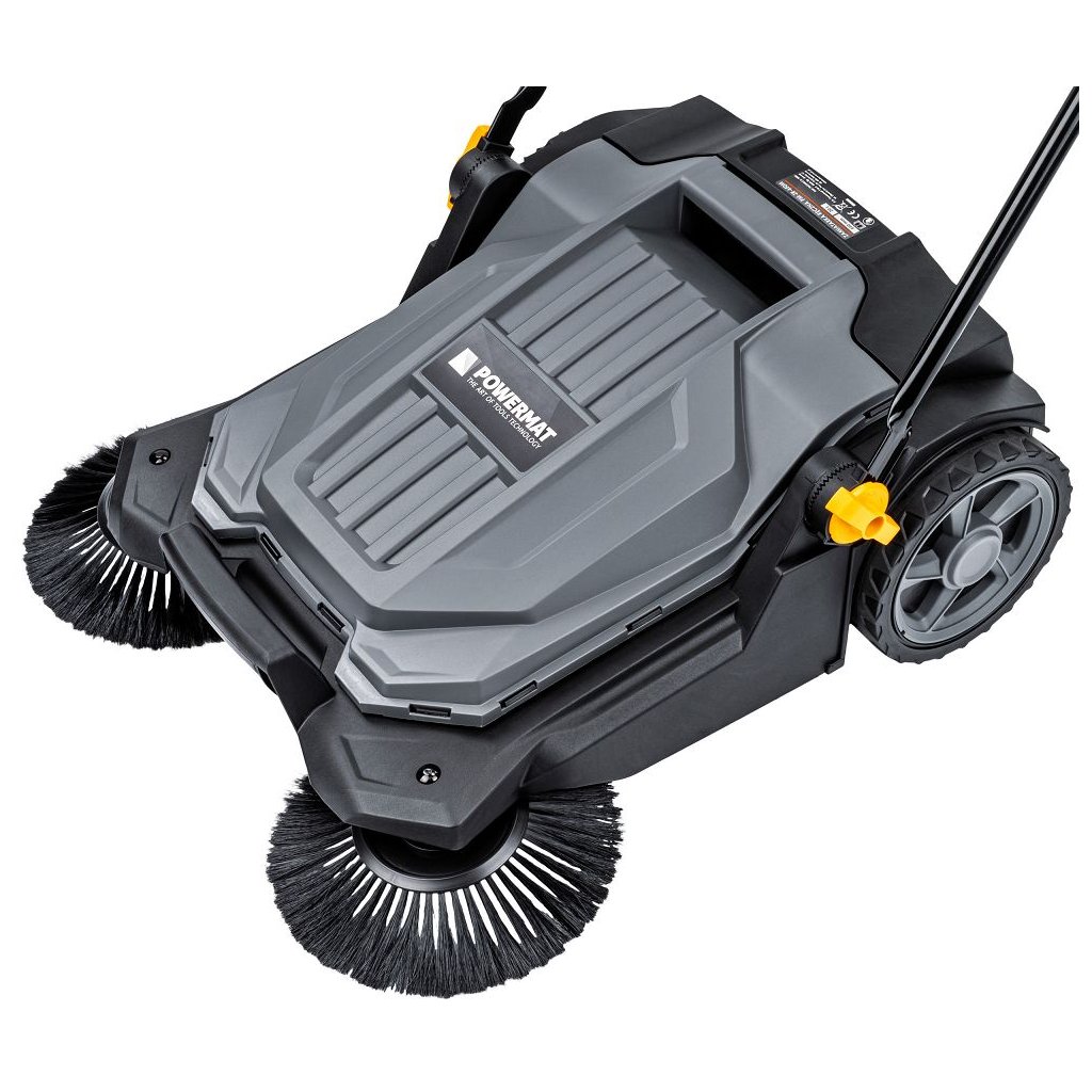 Ruční zametač Powermat PM-ZR-650M rychle vyčistí velké plochy bez potřeby elektřiny či baterií. Pracovní šířka 650?mm a výkon až 1800 m2/h šetří čas, 20litrový zásobník umožní dlouhou práci bez častého vyprazdňování. Systém kartáčů (valcový + 2 boční O 260?mm) sbírá prach, písek, listí i drobné nečistoty včetně hran a rohů. Nízká hmotnost 9,1 kg, gumová kola a přední otočné kolečko zajišťují snadné vedení uvnitř i venku.