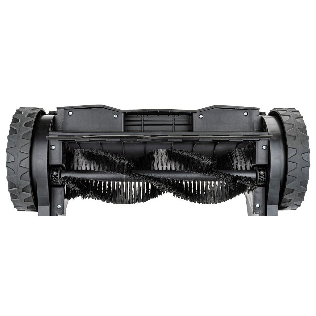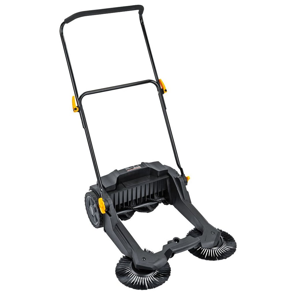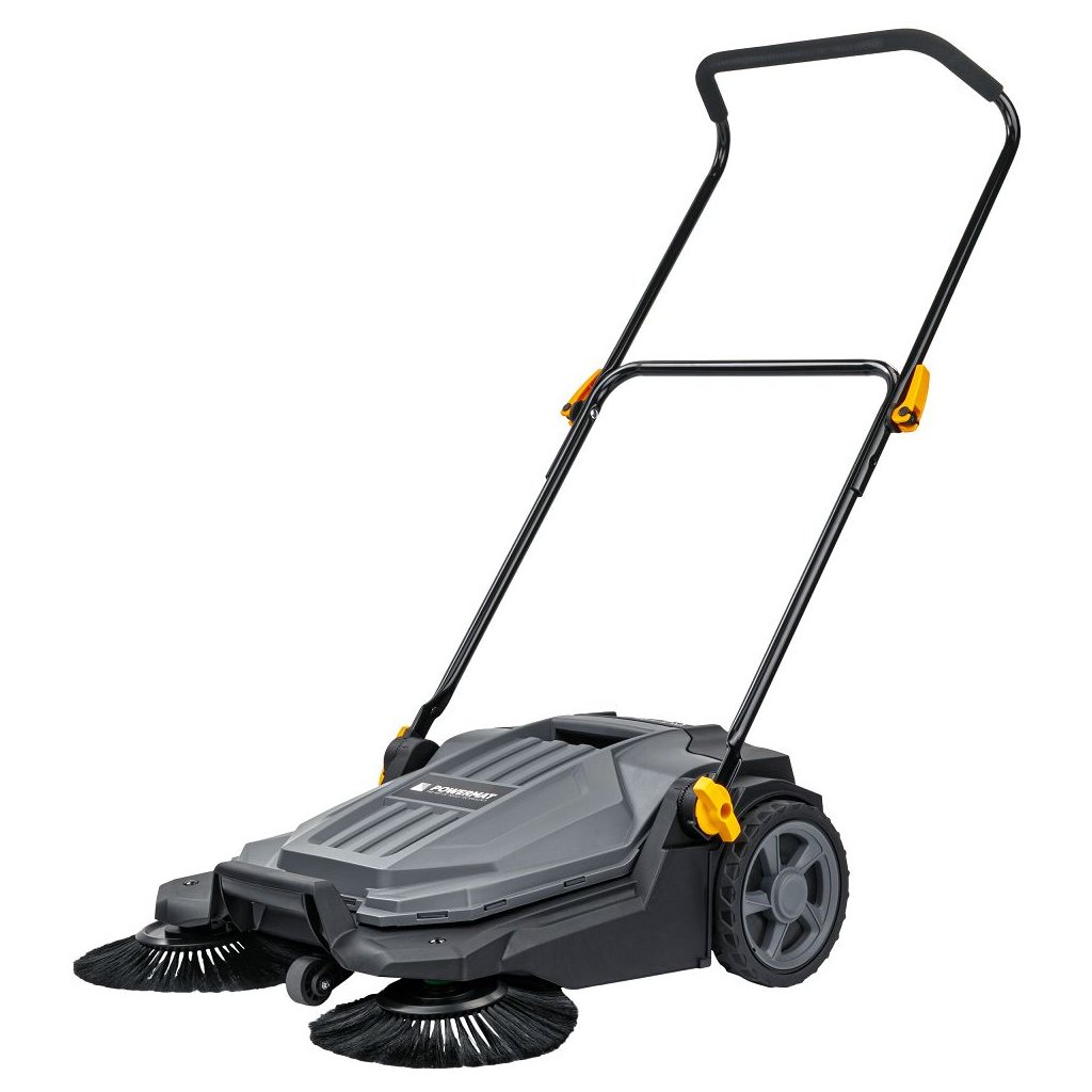 Ruční zametač Powermat PM-ZR-650M rychle vyčistí velké plochy bez potřeby elektřiny či baterií. Pracovní šířka 650?mm a výkon až 1800 m2/h šetří čas, 20litrový zásobník umožní dlouhou práci bez častého vyprazdňování. Systém kartáčů (valcový + 2 boční O 260?mm) sbírá prach, písek, listí i drobné nečistoty včetně hran a rohů. Nízká hmotnost 9,1 kg, gumová kola a přední otočné kolečko zajišťují snadné vedení uvnitř i venku.