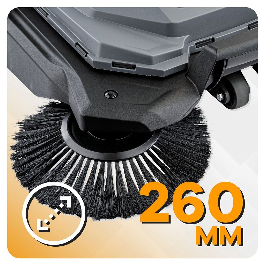 - Šířka záběru 650 mm a výkon 1800 m2/h – rychlé čištění rozsáhlých ploch