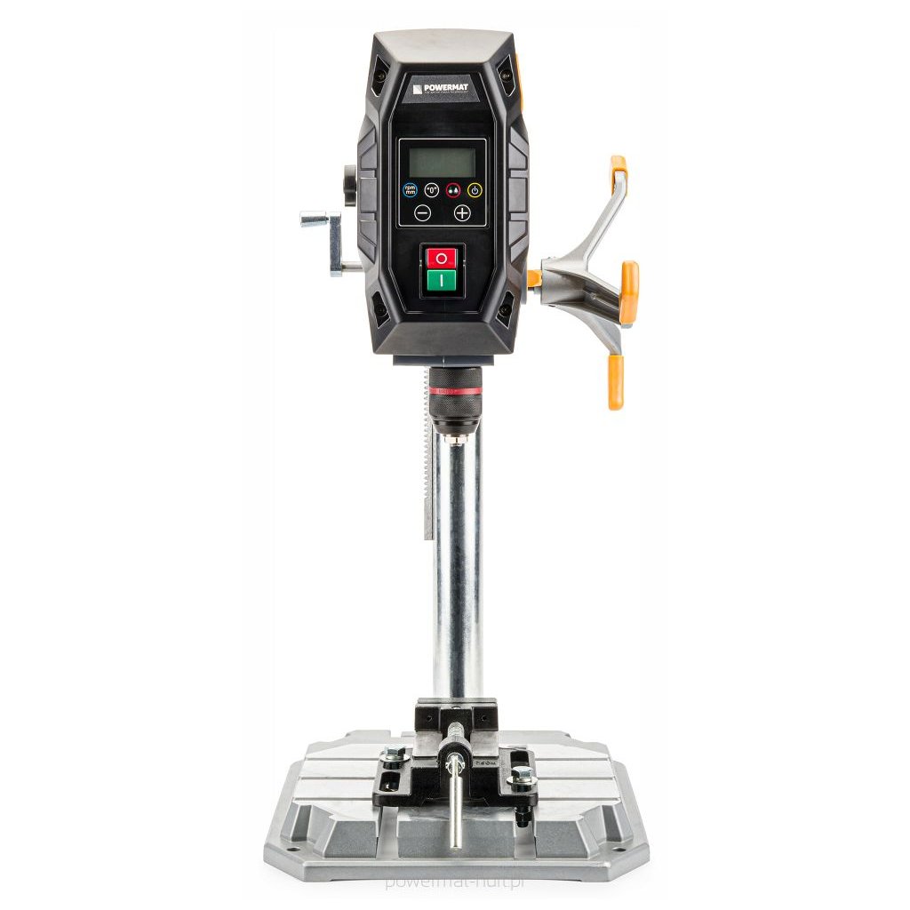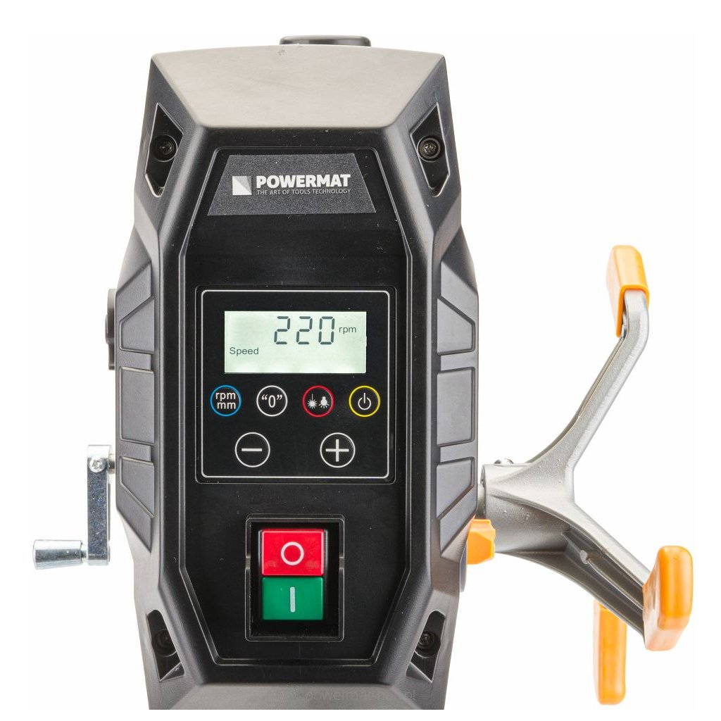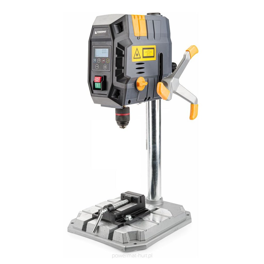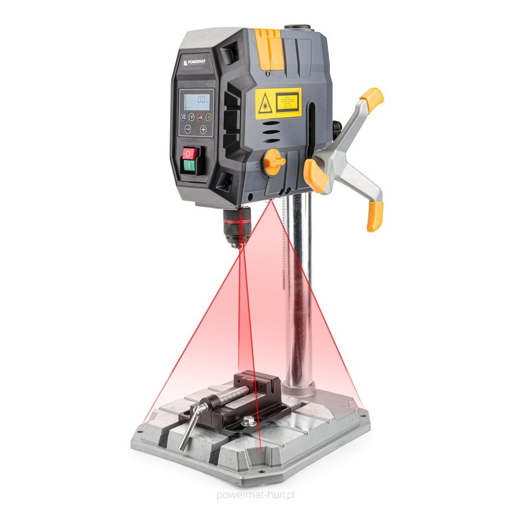 Dvourychlostní sloupová vrtačka POWERMAT o výkonu 1000W s křížovým laserem a LED podsvícením.