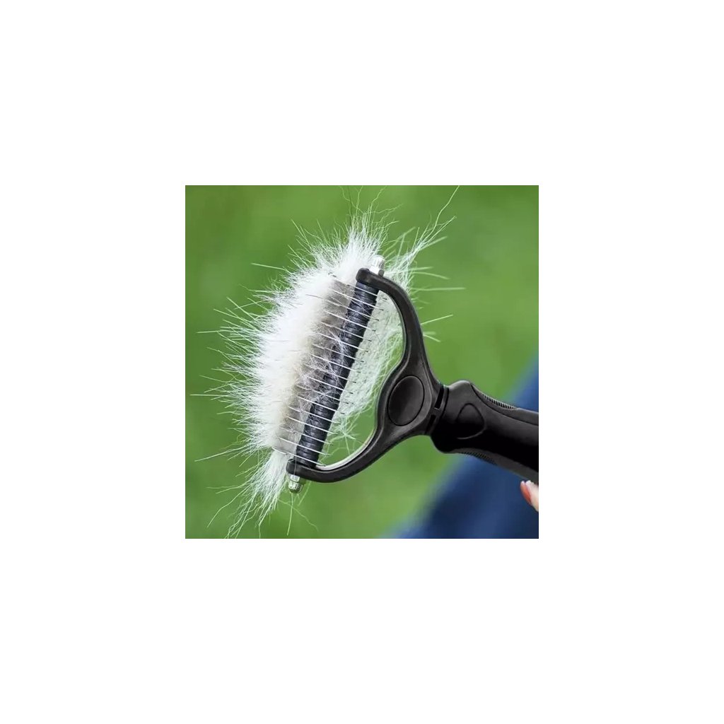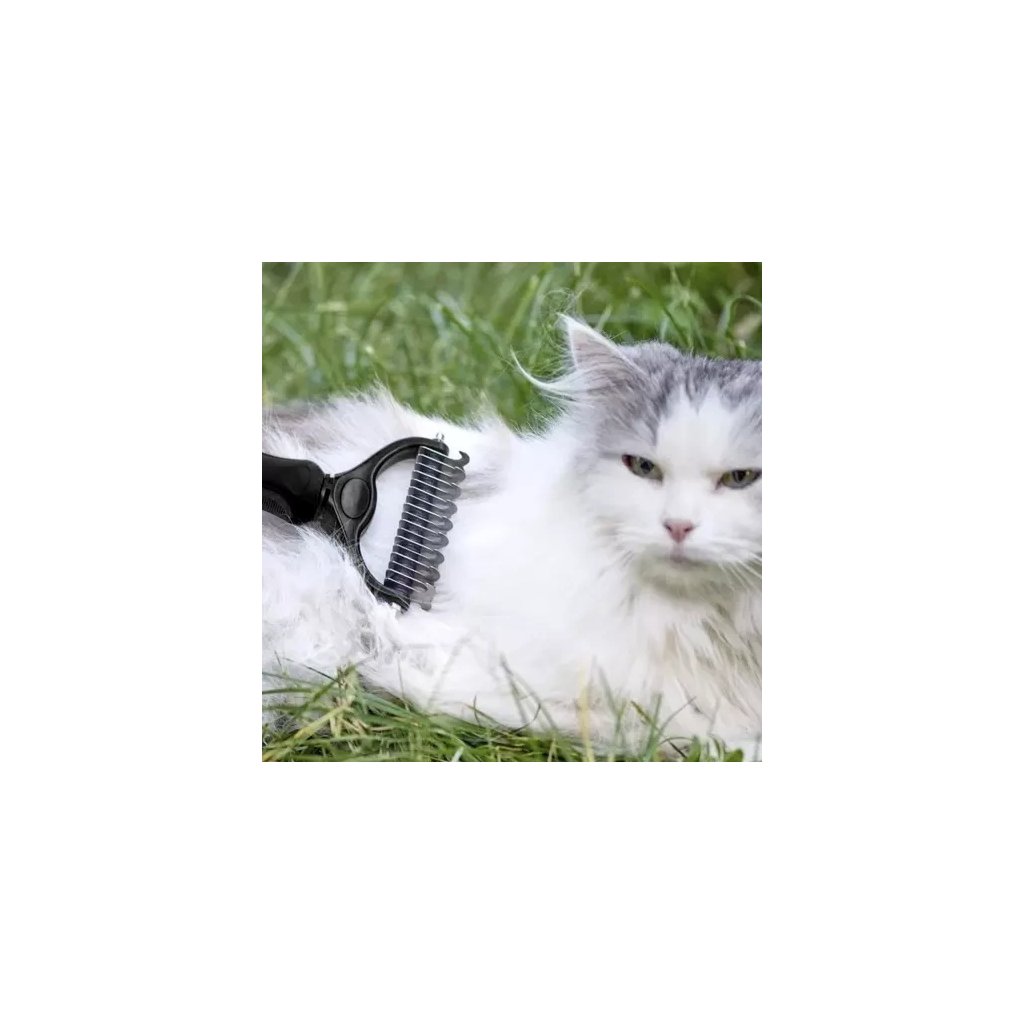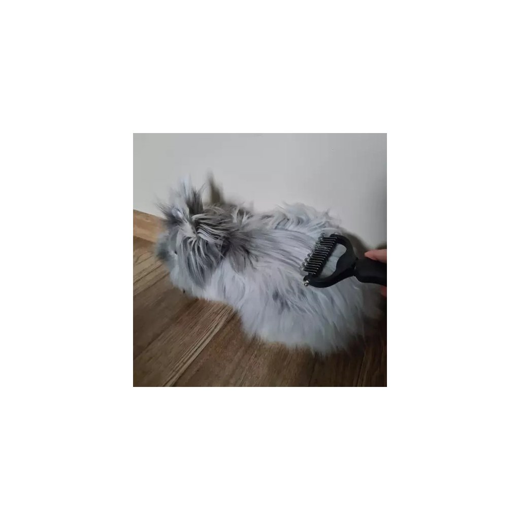 - Oboustranný design: jedna strana s 9 zuby (0,8 cm) pro hustou srst, druhá se 17 zuby (0,4 cm) pro jemnější srst