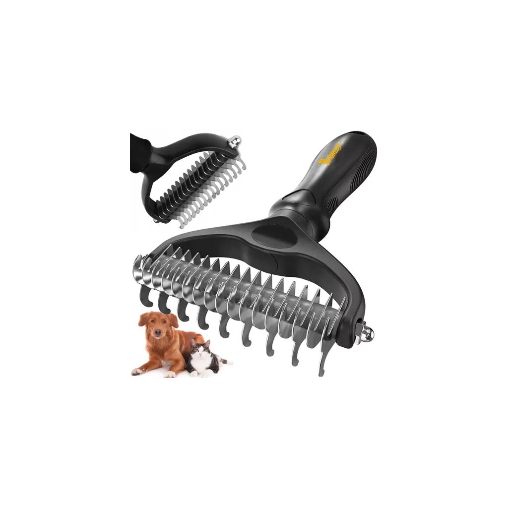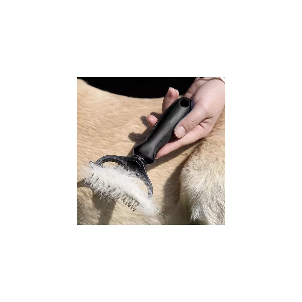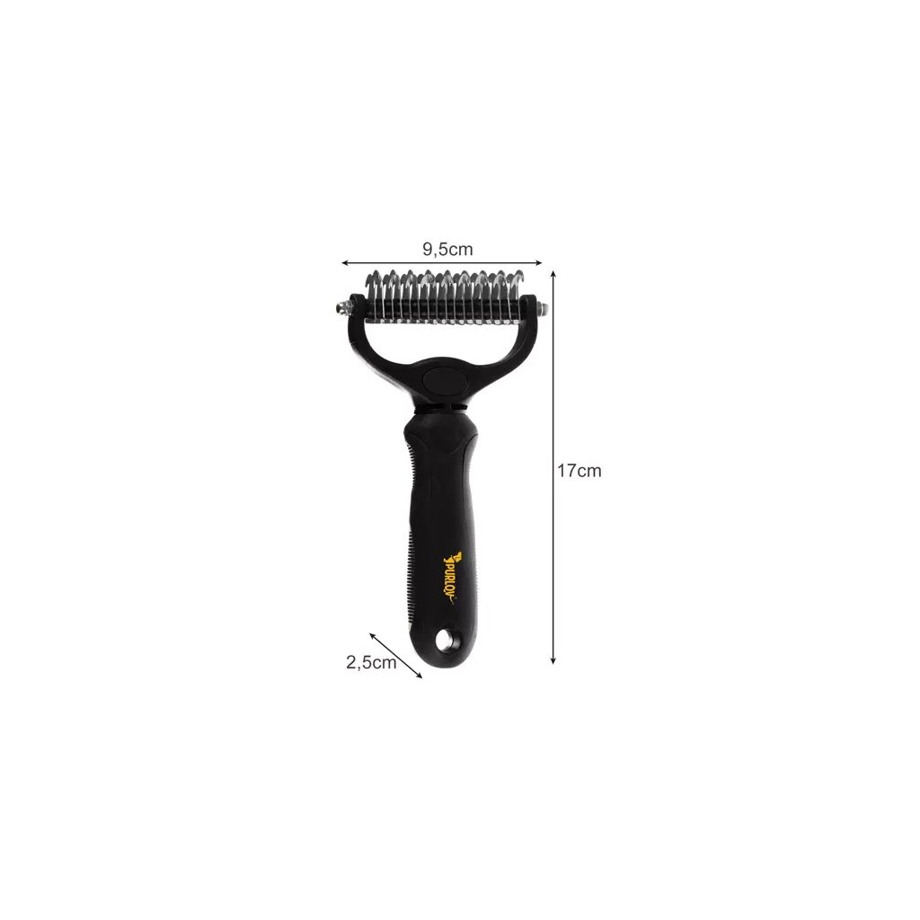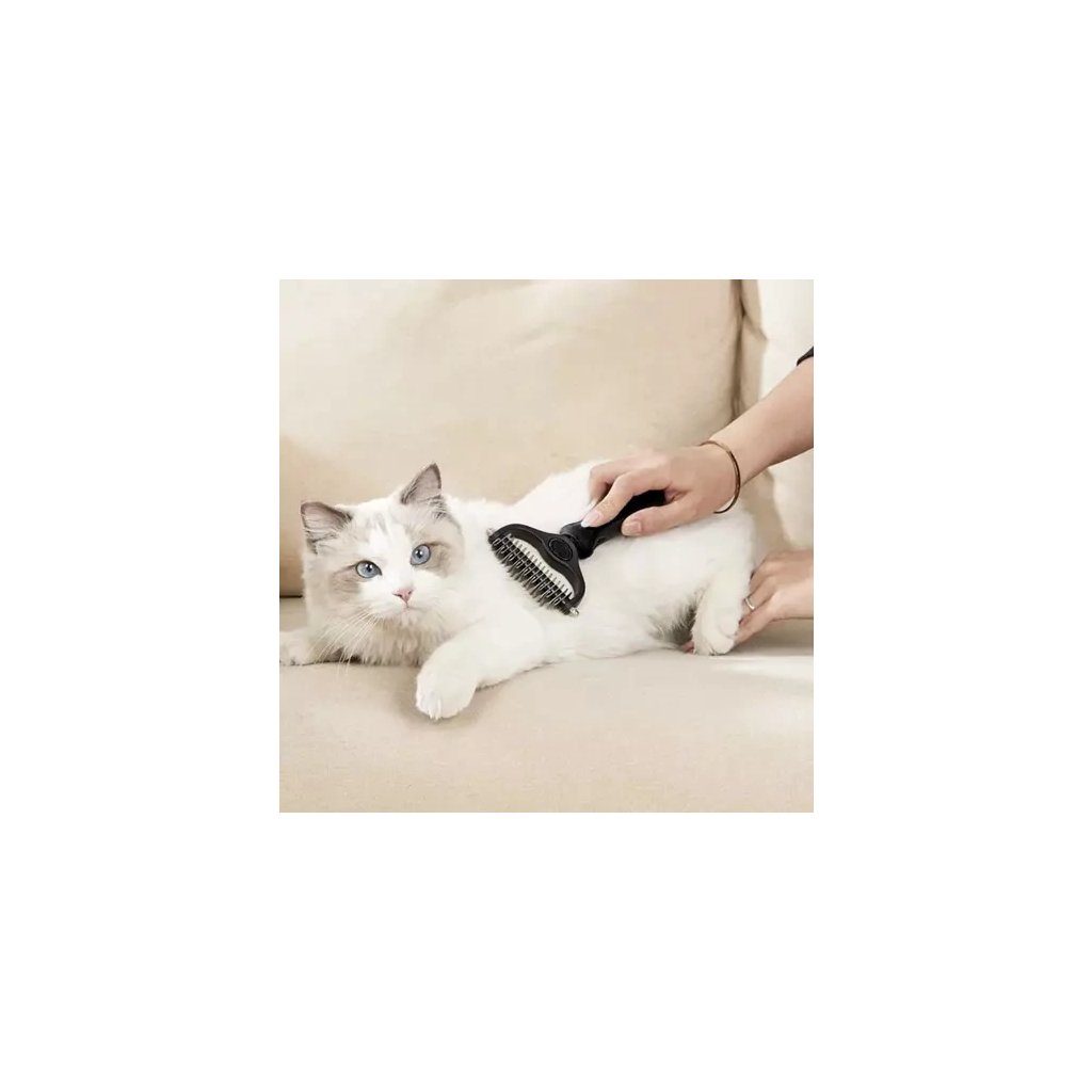 - Oboustranný design: jedna strana s 9 zuby (0,8 cm) pro hustou srst, druhá se 17 zuby (0,4 cm) pro jemnější srst