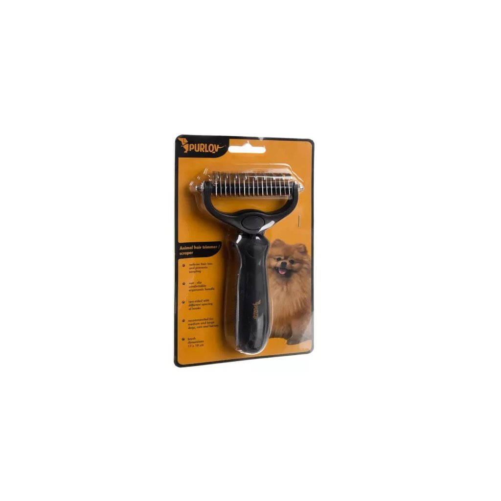 Trimovací hřeben Purlov 20427 je univerzální nástroj pro péči o srst všech typů domácích mazlíčků. Díky dvěma stranám s různou hustotou zubů je vhodný jak pro psy s hustou a bohatou srstí, tak i pro mazlíčky s jemnější podsadou. Pomáhá redukovat vypadávání chlupů, udržuje srst zdravou, lesklou a přirozeně krásnou. Ergonomický tvar rukojeti a zaoblené konce zubů zajišťují pohodlí a bezpečí při každodenním používání.