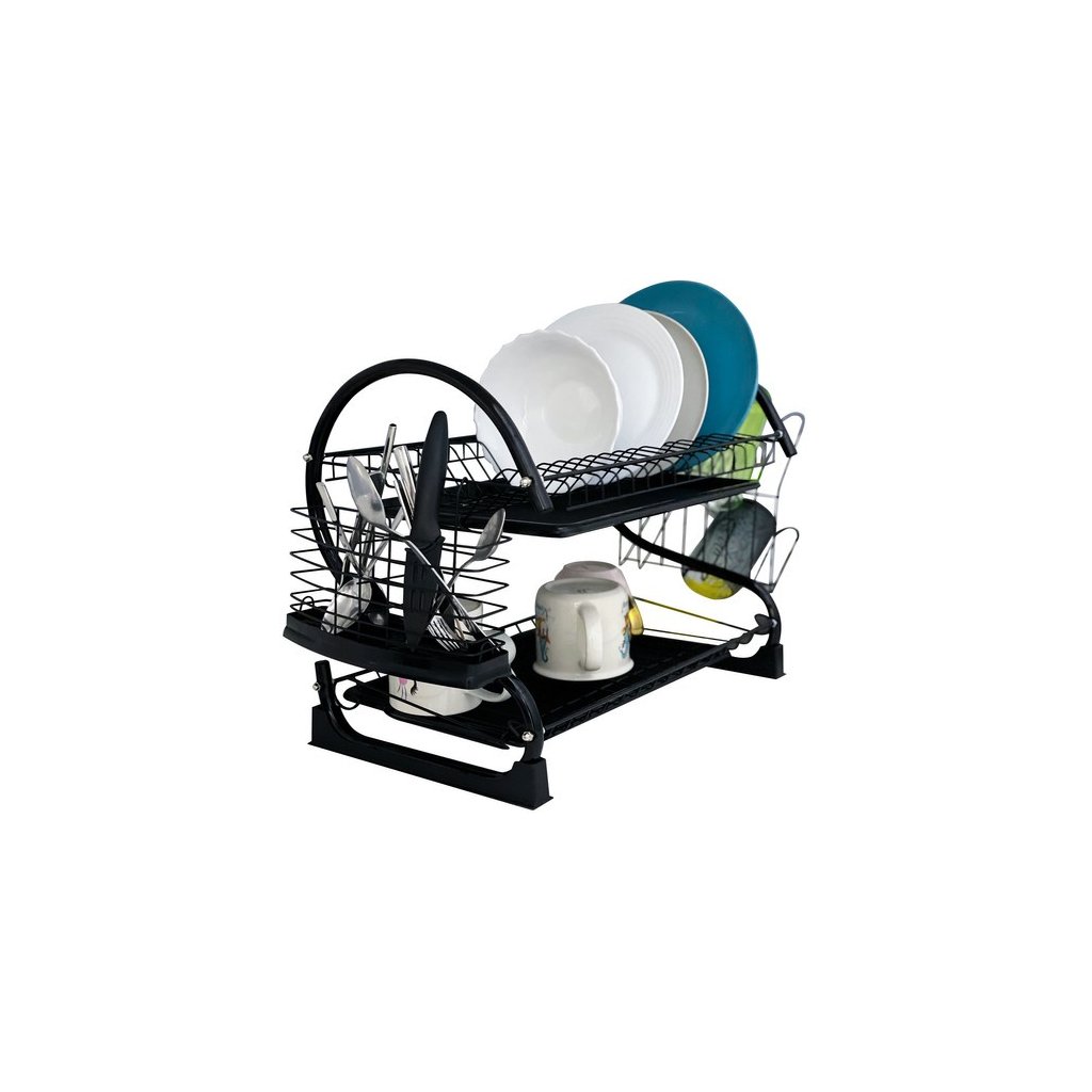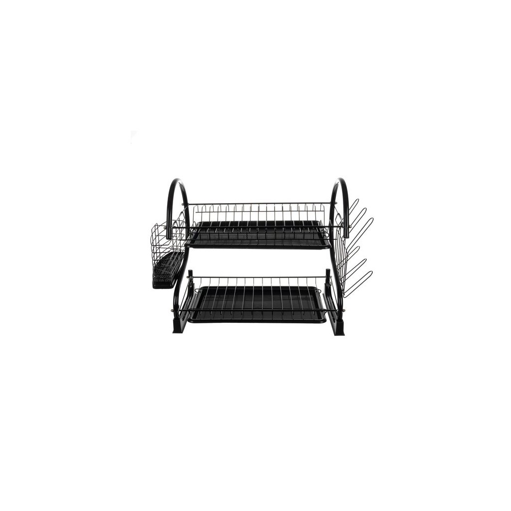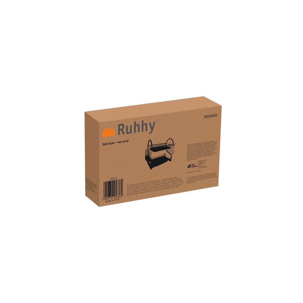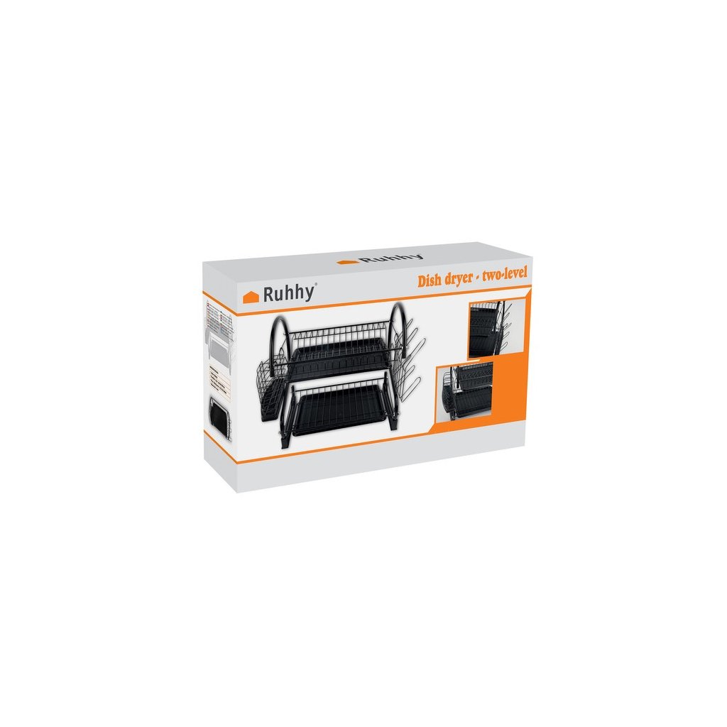 Dvouúrovňová sušička nádobí Ruhhy 24634 z černého práškově lakovaného železa nabízí dostatek prostoru pro talíře, misky, sklenice i příbory. Je vybavena odkapávači na každém patře a bočními držáky na šálky a příbory, čímž šetří místo a zároveň zajišťuje hygienické sušení nádobí. Moderní design v industriálním stylu perfektně doplní každou kuchyň.