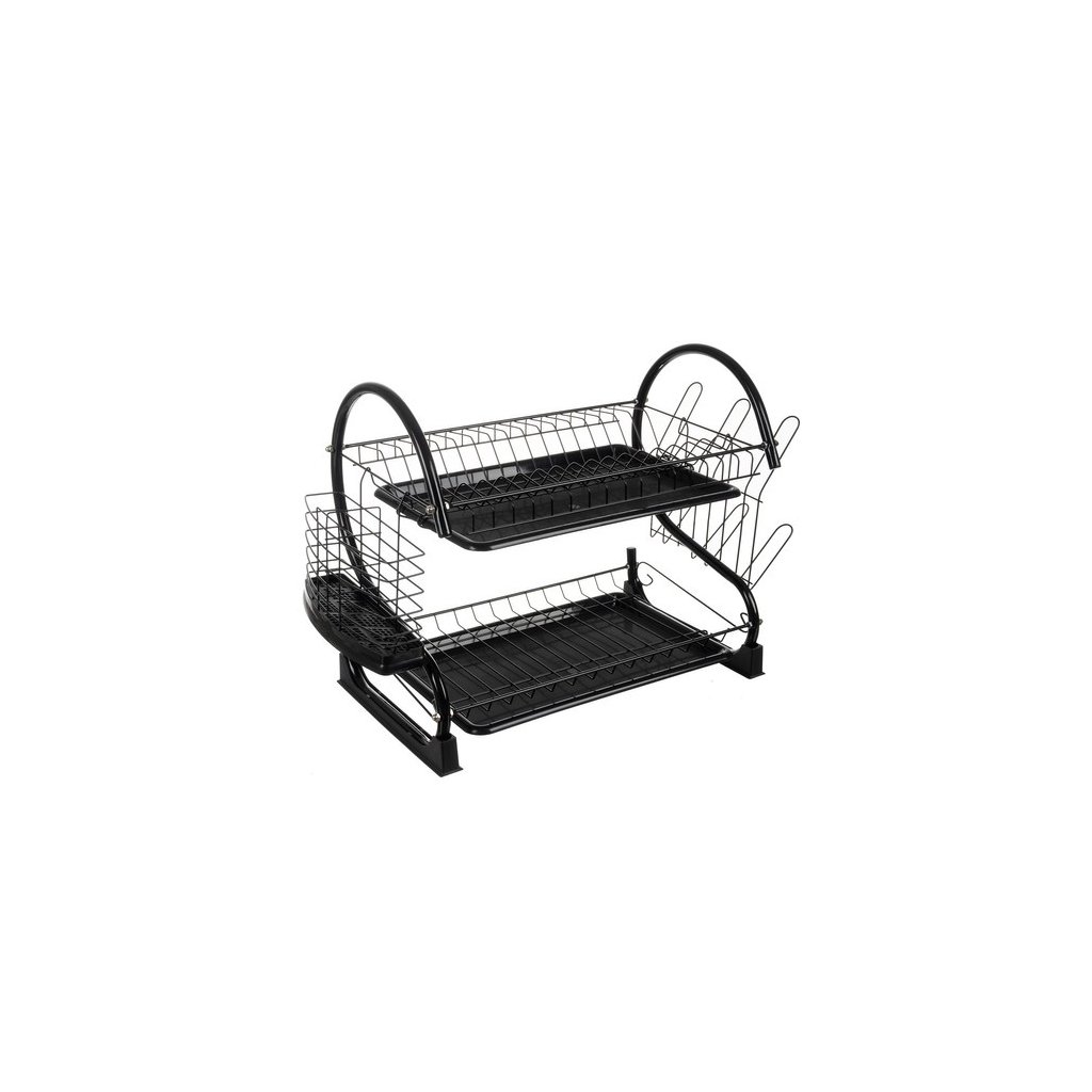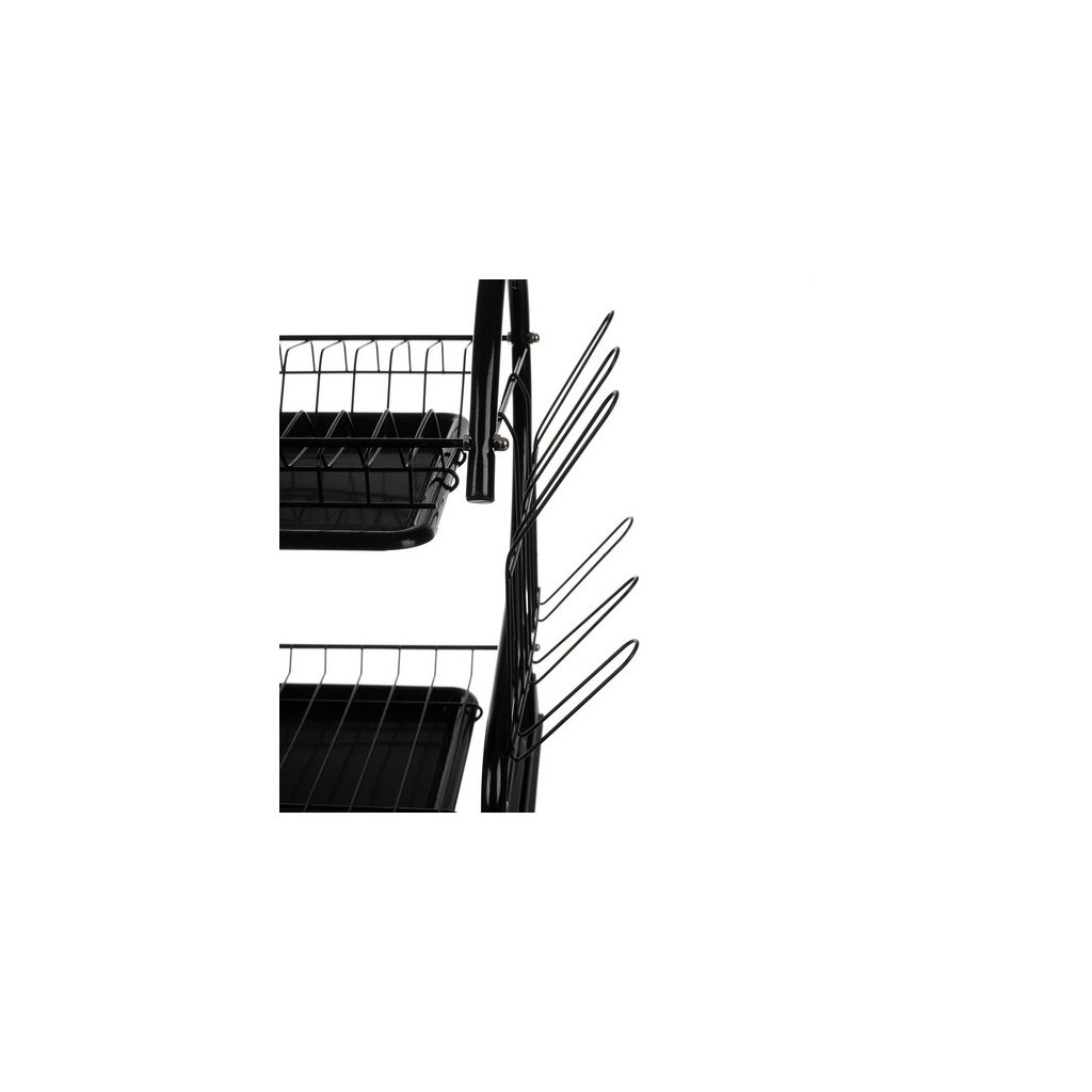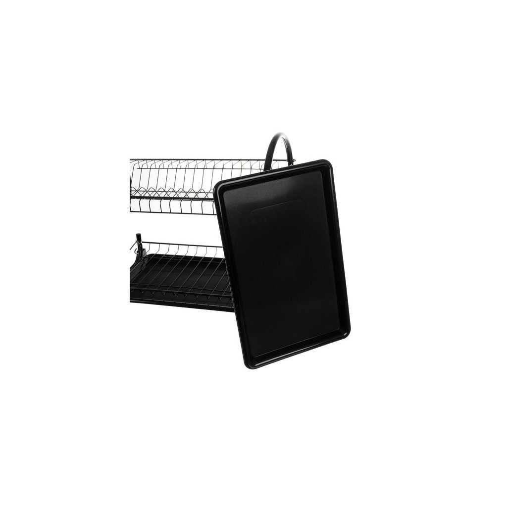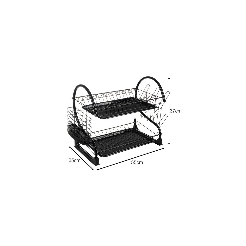 Dvouúrovňová sušička nádobí Ruhhy 24634 z černého práškově lakovaného železa nabízí dostatek prostoru pro talíře, misky, sklenice i příbory. Je vybavena odkapávači na každém patře a bočními držáky na šálky a příbory, čímž šetří místo a zároveň zajišťuje hygienické sušení nádobí. Moderní design v industriálním stylu perfektně doplní každou kuchyň.