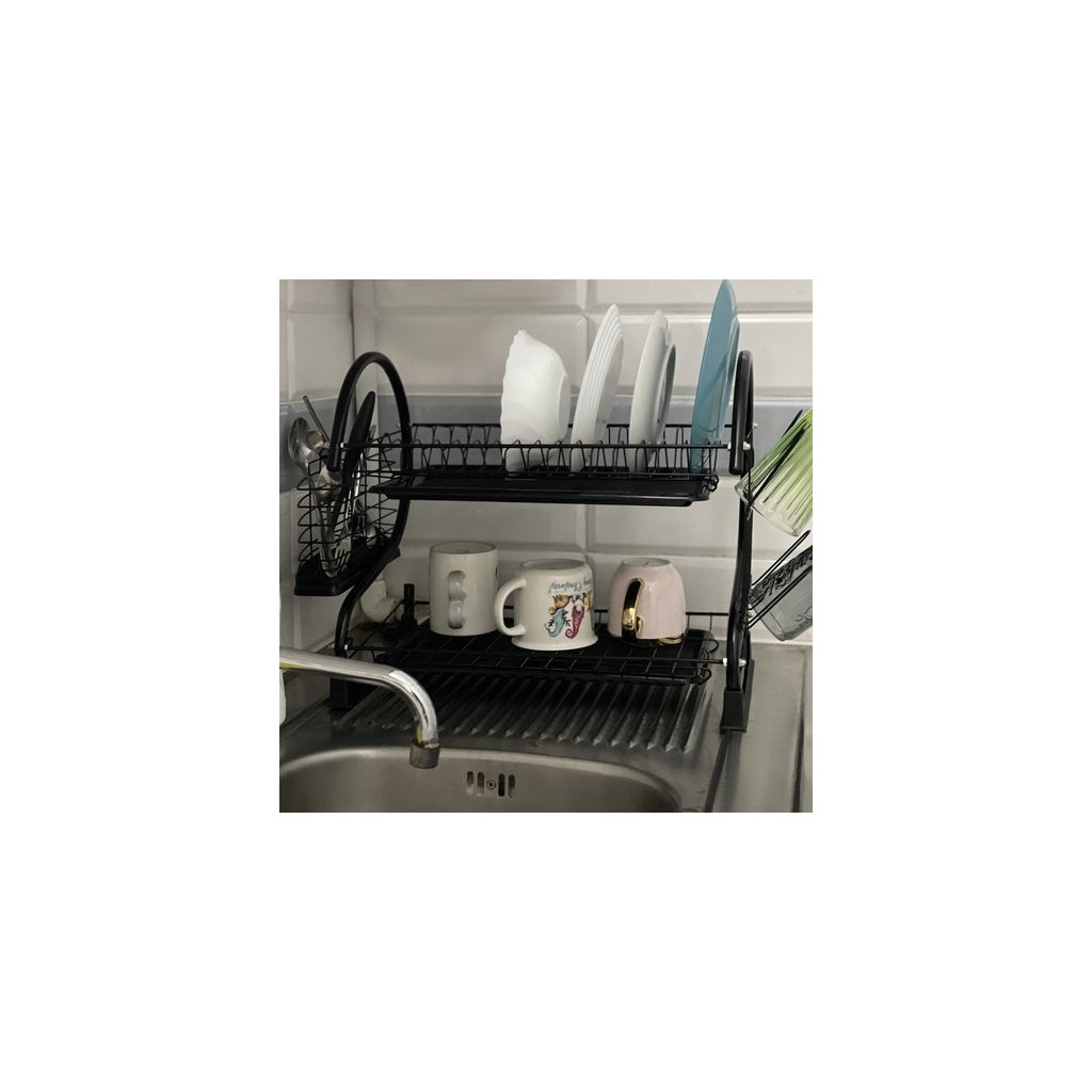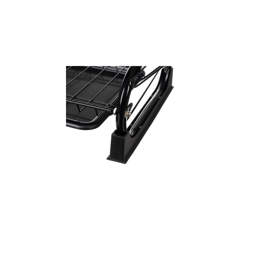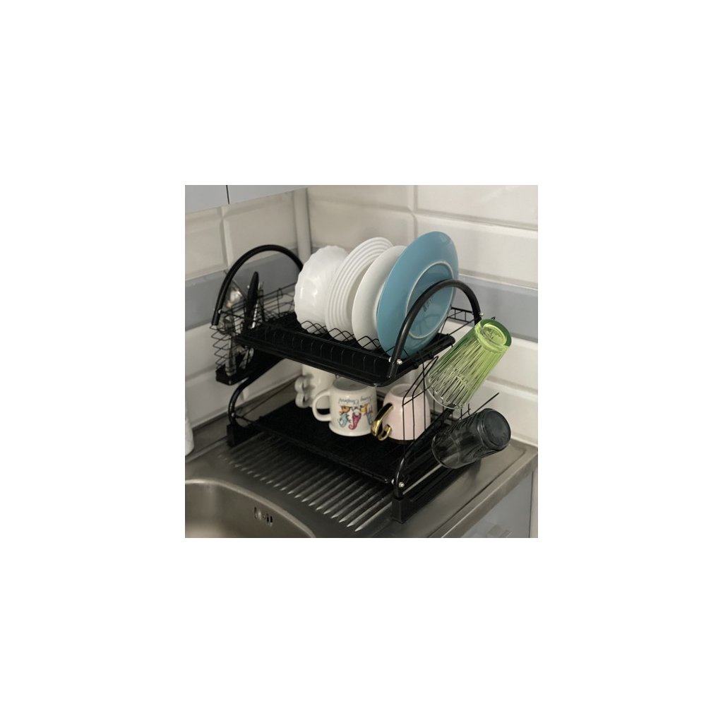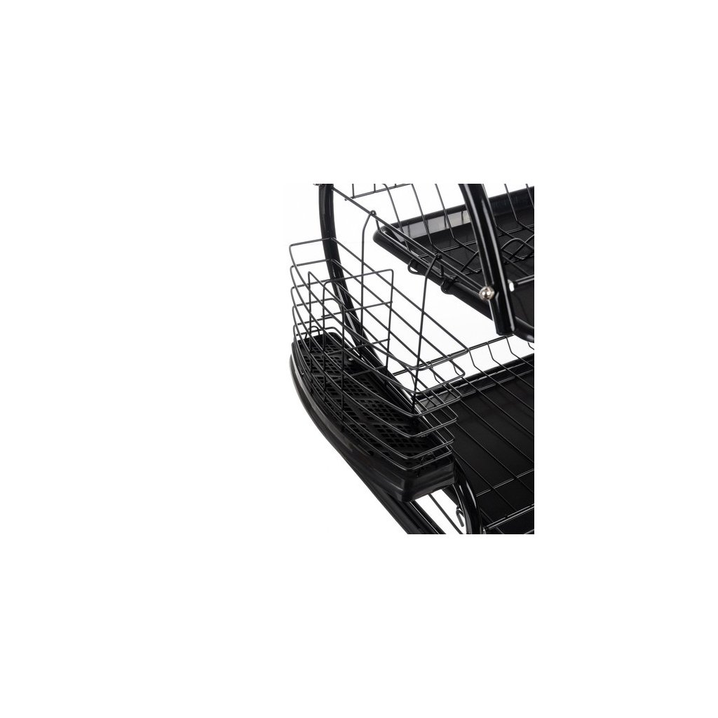 Dvouúrovňová sušička nádobí Ruhhy 24634 z černého práškově lakovaného železa nabízí dostatek prostoru pro talíře, misky, sklenice i příbory. Je vybavena odkapávači na každém patře a bočními držáky na šálky a příbory, čímž šetří místo a zároveň zajišťuje hygienické sušení nádobí. Moderní design v industriálním stylu perfektně doplní každou kuchyň.
