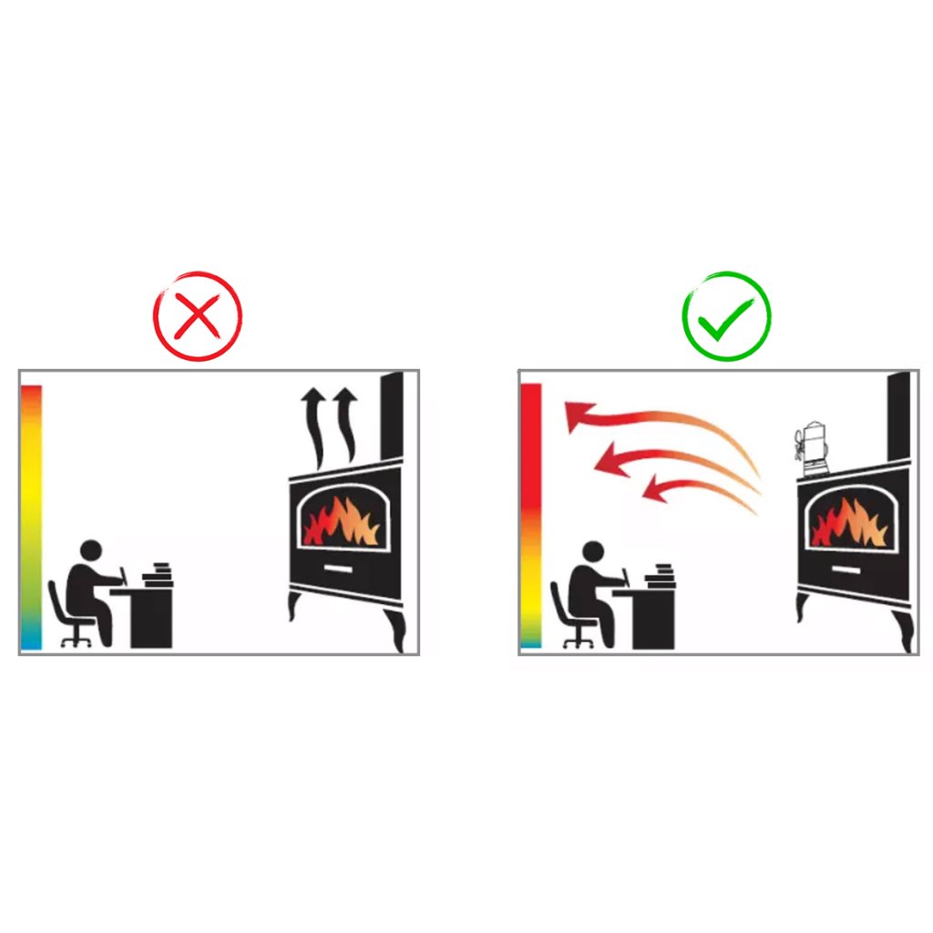 Ventilátor se automaticky rozeběhne při teplotě 50°C. Jeho účinnost je však nejlepší při dosažení vyšších teplot. Tento ventilátor, má oproti konkurenčním ventilátorům vyšší otáčky. Tímto dosahuje vyšší účinnosti a rychlé efektivity. Použitím ventilátoru dosáhnete nejhospodárnějšího (nejlevnějšího) způsobu rozehnání teplého vzduchu rovnoměrně po celé místnosti i za roh.